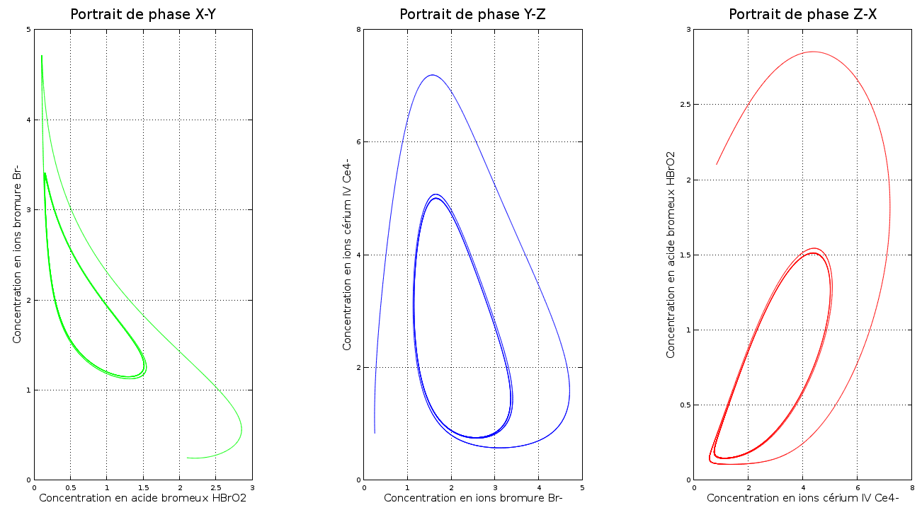 Les lettres x(t),y(t) et z(t) correspondent respectivement à la concentration en acide bromeux HBrO2, en ions bromure Br- et en cerium-IV Ce4- au cours du temps.