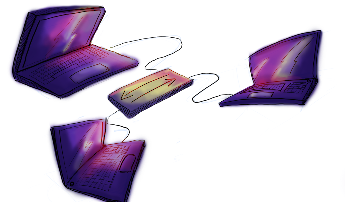 A la différence du village et de son facteur, les lettres, appelées « paquets » en réseaux informatiques voyagent sans assistance dans les rues, transformées en câbles pour l’occasion. Seul un étrange boîtier se trouve à l’intersection de ces câbles : un « switch ». Son rôle est d’aiguiller les paquets du bon côté.